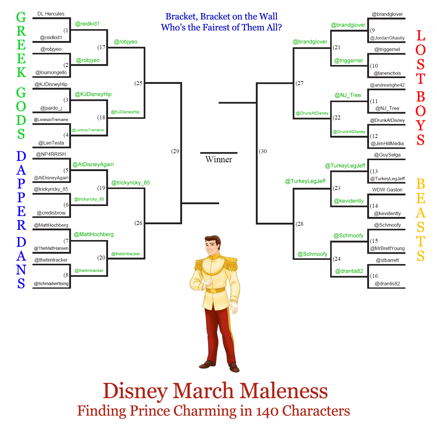 It’s simple: I’ve taken 29 Disney tweeps and tossed them into a bracket with yours truly and a couple of hunky Disney characters. Each day on twitter, I’ll call for votes in specific matches. You can vote once per match. Be sure to use the hashtag #DisneyMarchMaleness when you vote! The winner of each head to head matchup moves on to the next round. Let’s take a look at the bracket: